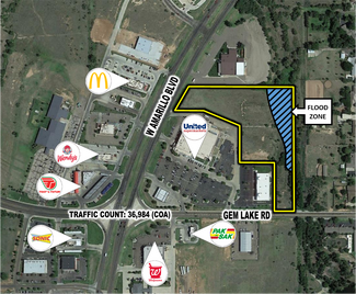 This property is located on W Amarillo Blvd and Gem Lake Rd and is adjacent to United Supermarkets. There is a reciprocal easement via a common area drive to access the property from Gem Lake Rd. A small portion of the property is in a flood zone which provides drainage for the plot. Owner will subdivide. The traffic count at the intersection of Amarillo Blvd W and Gem Lake is 31,233 vehicles per day per the City of Amarillo. The property is surrounded by many national retailers including, United Supermarkets, Wingstop, T-Mobile, Pizza Hut , Chick-fil-A, McDonalds, Starbucks, O’Reilly Auto Parts and Walgreens. All utilities are available to the site.
