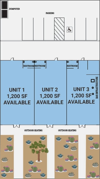 - Three 1,200 SF spaces available for lease individually or combined. - Each space features its own bathroom, front and rear entrance, and separate metering. - Fully remodeled interior and exterior for a modern, updated look. - Grandfathered for food and beverage use, with Unit 3 featuring bar infrastructure and a liquor license available separately.