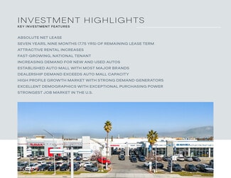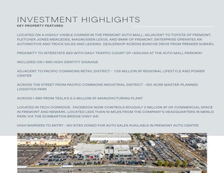 As exclusive advisors to the Seller, CBRE is offering the opportunity to acquire the fee simple interest in the real property occupied by Premier Automotive within the Fremont Auto Mall located at 5601-5701 Cushing Parkway (the “Property”). Premier Automotive Center is a multi-brand Class A auto dealership, built in 2007 and expanded in 2016 and 2022, providing new and used car sales and service for Nissan and Subaru. The Property includes approximately 66,995 square feet of improvements including two showrooms, three sets of service bays and a car wash. The Property encompasses two land parcels totaling approximately 7.22 acres. The entire site is leased to Premier Automotive through 2033 under an absolute NNN lease. This Property is centrally located in the East Bay submarket with excellent access to Oakland/East Bay and San Jose/ South Bay via Interstate 880, and Silicon Valley via the CA-84 Dumbarton Bridge. The Property is located in the Fremont Auto Mall which offers most major brand auto dealerships including Mercedes Benz, BMW, Lexus, Porsche, Acura, Toyota, Honda, Hyundai, Chevrolet, Cadillac, Buick, and GMC. Premier Automotive Center delivers a strong current yield with built-in rental increases over the lease term extending 7+ years.