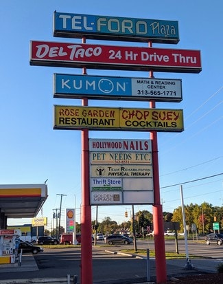 The highly visible Tel Ford Shopping Plaza is located at the busy intersection of Telegraph and Ford Roads where over 100,000 cars travel past per day. The strip is very close to the I-94, I-96, and Southfield Freeways. This commercial retail center has separate 5 buildings which house multiple restaurants, medical facilities, salons and retail store fronts and a brand new Shell gas station. Large signage is available on both Telegraph and Ford Roads.