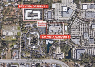 Bay Vista Gardens, located at 5655–5729 Rio Vista Drive in Clearwater, Florida, is a well-maintained suburban office park offering flexible space configurations and strong regional accessibility. Built in 1997, the property consists of multiple single-story buildings with masonry construction, professional landscaping, and ample surface parking. Suites range from approximately 3,400 square feet to over 16,000 contiguous square feet, designed with efficient layouts that include reception areas, private offices, conference rooms, and break areas. One available suite also features a flex component with 900 square feet of warehouse space and an overhead door, supporting light industrial or hybrid office users. Situated minutes from Roosevelt Boulevard, Bayside Bridge, U.S. Highway 19, Courtney Campbell Causeway, and I-275, the location provides convenient connectivity to Clearwater, St. Petersburg, and Tampa. The property is approximately two miles from St. Pete–Clearwater International Airport and less than 30 minutes from Tampa International Airport, reinforcing its appeal for regional and corporate users. Bay Vista Gardens is ideally suited for professional services, technology and back-office operations, and flex or light R&D tenants seeking a highly accessible and professionally managed office setting.