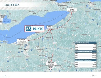 The PPG Paints is located near the signalized, hard corner intersection of Perry Hwy and Young Rd with a combined (17,400+ VPD). Perry Blvd, is the major thoroughfare serving the city of Erie. The PPG Paints benefits from its strategic positioning along a high-traffic corridor with excellent visibility on U.S. Route 19. This major arterial road supports strong brand recognition and easy access for both retail customers and contractors. The surrounding area includes a balanced mix of residential neighborhoods and commercial properties, providing a steady customer base. The site offers ample parking and convenient access, which is essential for frequent visits and large order pickups. Additionally, this stretch of Perry Hwy has limited direct competition in the immediate vicinity, allowing PPG to capture local market share without the saturation found in busier retail zones. The store also benefits from being part of an established commercial area, drawing consistent traffic from nearby businesses while standing out as a specialty destination. Erie itself supports a solid base of construction and property maintenance activity, making this location well-positioned for repeat business and long-term viability.