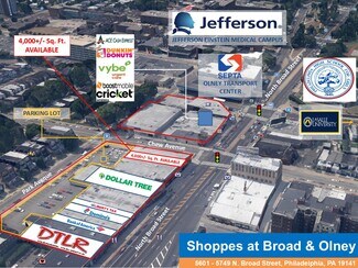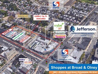 4,000 SF Available at 5705 N. Broad Street (8/1/26 occupancy) and near Dollar Tree. The Landlord’s existing tenant mix includes: Dollar Tree, Bank of America, Domino’s Pizza, DTLR, Dunkin’, ACE Cash Express, Liberty Tax, Affectionate Home Care. Cricket Wireless, Boost Mobile, Deli, nail salon, Chines-Style take-out, childcare and apparel. Additionally, work is underway for Vybe Urgent Care. The Broad & Olney Corridor of North Broad Street in Philadelphia, PA is across the street from the second busiest transportation hub in Philadelphia, the SEPTA Olney Transportation Center. Additionally, within a one-mile radius, over 35% of the workforce uses public transportation to commute to work and within that one-mile radius is a dense population of 56,028 and households in excess of 19,000. Major streets such as Old York Road, Stenton Avenue and Olney Avenue funnel to this area as well. Institutions around this market also support the customer base such as: The Einstein Medical Center, LaSalle University, The Philadelphia High School for Girls a/k/a “Girls High” and Central High School.
