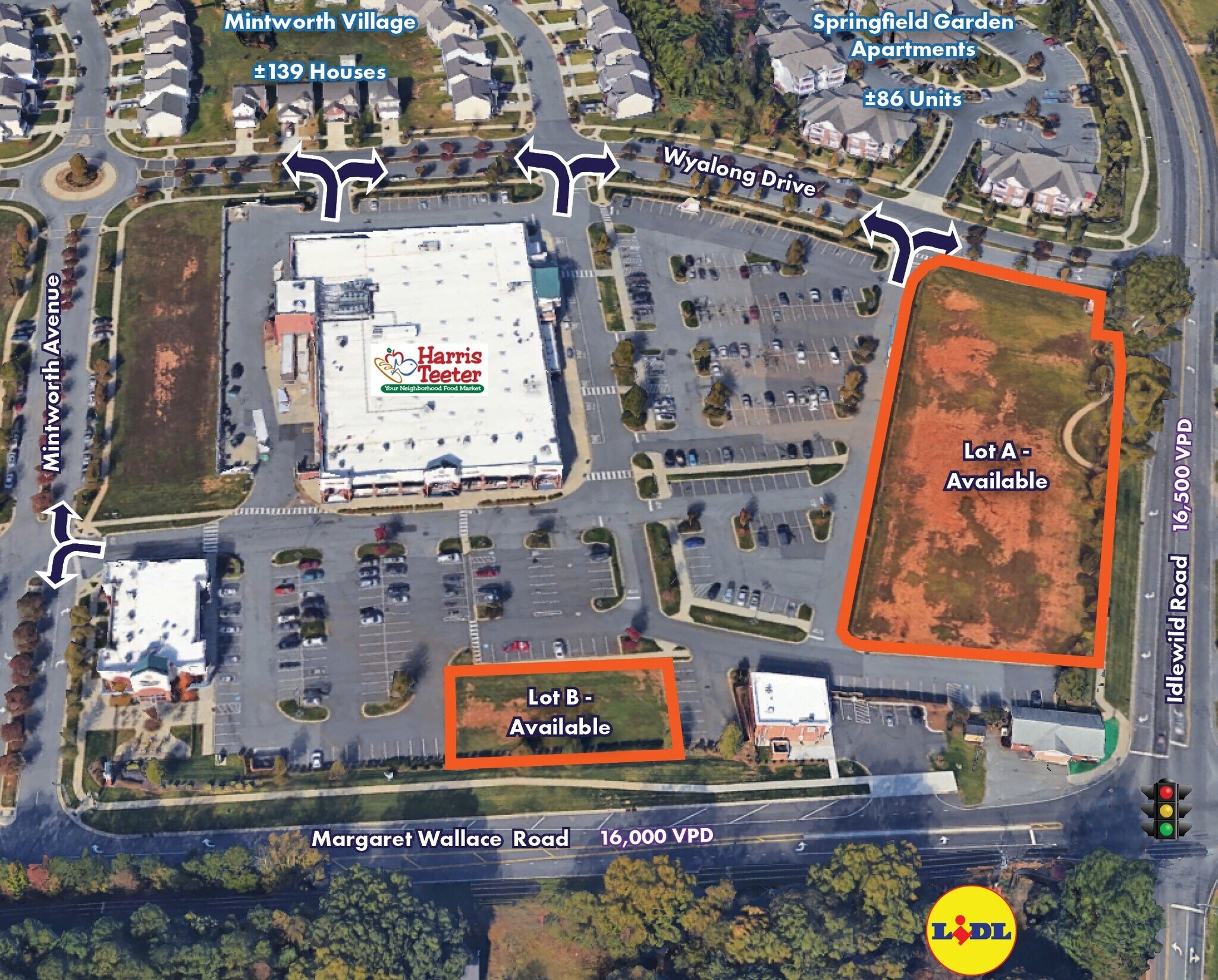 Mintworth Commons offers two commercial outparcels for sale within a ±64,079 SF Harris Teeter–anchored shopping center located at the signalized intersection of Idlewild Road and Margaret Wallace Road in the east Charlotte/Matthews submarket. Lot A consists of ±1.648 acres with B-2 (CD) zoning and an approved car wash site plan, while Lot B is a ±0.33-acre site zoned CG (CD) suitable for a variety of commercial uses. Both sites are served by municipal water and sewer and benefit from strong traffic exposure, established retail synergy, and convenient access to Independence Boulevard (US-74) and I-485.