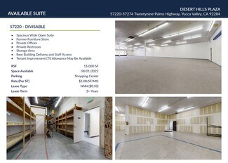 6 months free rent with a 5 yr term. 15,000 SF Available and Divisible. Desert Hills Plaza is home to many of your favorite retail tenants Ideal for a business wanting great visibility. Best Small Desert Town runner-up Yucca Valley, California. According to Travel + Leisure 2023 best small towns in America. NEW Tesla Charging Stations Major Intersection Great Visibility High Traffic Count Abundant Parking Outstanding Ingress and Egress Town Hall is West of this center.   Job growth in Yucca Valley has increased 2.3% in the last year. Future job growth is predicted to reach 38.7% over the next ten years, higher than the US average of 33.5%.