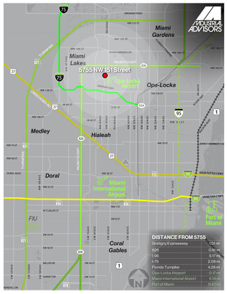 Functional industrial space in Miami Lakes with frontage on NW 57 Avenue, featuring ±1,840 SF of warehouse, ±780 SF of office, ±20’ ceiling height, and 1 street-level door. The property also includes an air-conditioned warehouse, 3 assigned parking spaces, and excellent access to the Palmetto Expressway, Gratigny Expressway, I-75, Florida’s Turnpike, and Opa-Locka Airport.