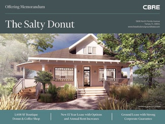 This is the 8th Florida location for The Salty Donut, an expanding boutique donut and coffee shop which originated in Miami, Florida. The tenant signed a new 15 year ground lease providing long-term cash flow with zero responsibilities to the landlord, four 5-year options to renew at the conclusion of the base term, and 2% annual rent increases throughout. This location is set to open in early 2025 and will serve as their hub/commissary for future growth in Tampa Bay.
