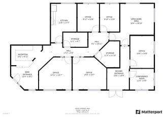 The floor plan features a welcoming lobby and reception area, a large waiting room, multiple private offices, two large group rooms, a break room, storage areas, and two shared restrooms. The layout is flexible and supports both collaborative and private work environments, making it ideal for multi-disciplinary practices or shared tenant use.