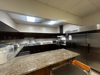 The main wing features a large sanctuary assembly area, multiple private classrooms and offices, storage, cafeteria, and a light commercial kitchen with a three-compartment sink and commercial equipment.