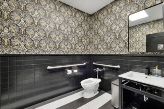 The Avondale West, nestled in the heart of Midfield in Woodfield Square, is a 10,000 square foot event space. Guests are greeted by the grand lobby, adorned with timeless wood accent walls. The venue boasts two distinct event rooms designed to cater to a variety of preferences and styles. The first room, named the Formal Ballroom, exudes opulence with its sparkling chandeliers, beautiful white marble floors, high ceilings, modern lighting and gorgeous artwork. This spacious area is perfect for large gatherings, such as weddings, galas, and corporate events, accommodating up to 300 standing guests with ease and approximately 160 seated, dependent on the setup.