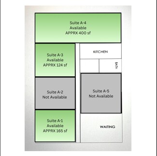 The building of 5991 Parkway North Blvd, Cumming, GA 30040 is a two story office building with a beautiful exterior located at Exit 13 of Interstate 400. This listing is the leasing the 1st floor, Suite A with 3 of the 5 suites available at 689 sf total that are listed below. Suite A-1 is 165 sf at $685.00 monthly Suite A-3 is 124 sf at $650.00 monthly Suite A-4 is 400 sf at $1300.00 monthly
