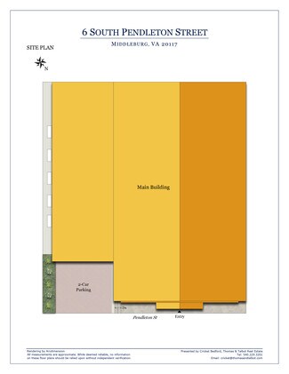 Thomas & Talbot Estate Properties, Inc., in coordination with Cushman & Wakefield | Thalhimer, presents this acquisition opportunity in the heart of Middleburg as the former tenant is relocating within town, leaving behind a move-in-ready asset with upgraded finishes. 6 Pendleton Street comprises approximately 5,639 square feet arranged over two stories with stately solid brick construction and a traditional style standing-seam metal roof. With front and rear entrances and staircases that allow for multi-tenant layouts, this is a highly flexible opportunity for investors or owner/users. Features include a reception area, private offices, open work areas, conference rooms, three half baths, a supply/copy room, and a large break room. Users will also have two private parking spaces in front of the building. Zoned C-2, permitting professional offices, service businesses, restaurants, retail, fitness studios, and more, 6 Pendleton Street’s versatility allows any occupant to create a novel destination within the heart of Middleburg’s downtown. Located one storefront south of Washington Street, the primary corridor of Middleburg’s Downtown Historic District, 6 Pendleton Street benefits from superior visibility and walkability. Boutiques, art galleries, and beloved local restaurants line the characterful thoroughfare, a convenient, amenity-rich environment for both staff and guests. Consumer-centric uses are supported by the area’s affluent residential base, as the town’s proximity to high-income Northern Virginia employers has made it popular for commuting professionals. Demographic estimates also call for steady population growth at an annual rate of 1% through 2029 within a 5-mile radius.