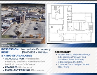 Building has Easy access to all major roadways: LIE, Sagtikos Parkway and Southern State Parkway. Only 3 blocks from LIRR and 1 minute from Tander Deer Park Outlets. AVAILABLE FOR: Professional, Financial, Business, Administrative, Medical Use, or Call Center. IMMEDIATE OCCUPANCY