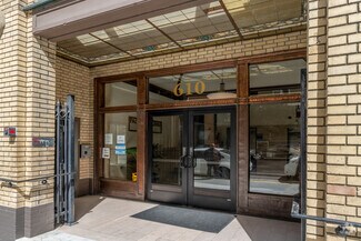 Pacific Building at 600 16th Street is a five-story rectangular building constructed in 1913 by Woodmen of the World. It was built with Renaissance Baroque ornamentation, initially designed for ground-floor storefronts, upper-floor offices, and lodge rooms, with the lodge rooms later converted to offices. Construction is steel frame on the lower three floors with reinforced concrete columns on the upper two floors and brick curtain walls on all floors. The property is secured through a key code and dial-in entry, 40 on-site parking spaces, and on-site storage in the basement. Recent renovations to the common areas preserved most of the historically significant interior woodwork and hallways.
