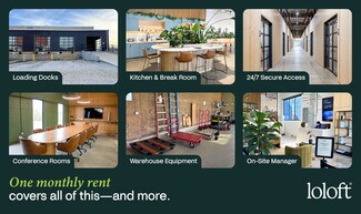 A 28,022 SF facility offering multiple private warehouse units from 150 sq ft to customizable spaces over 2,000 sq ft. The property includes security video surveillance, loading docks, and all-inclusive pricing. Shared amenities include high-speed internet, utilities, meeting rooms, free parking, phone booths, a kitchen, and regular networking events.
