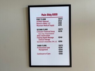 Suite #6240 is 1,094 SF, and is available right away. $1,650/month (water/sewer & trash service included). 2nd floor space, has a kitchenette, 4 office/treatment rooms, and waiting room with reception. Shared bathroom in common area. The tenant is responsible for the electricity and internet. Preferred lease term 2+ years, but one-year would be considered. Premier executive office park located on Aiken's south side. Three attractive, modern, multi-tenant buildings, totaling over 90,000 SF on 8 acres, provide tenants a variety of office spaces well suited for executive, administrative, medical, healthcare and corporate uses. Building 6000 was built in 1989 on fairly level topography, with asphalt paving (ample parking), concrete curbing & sidewalks, and good landscaping. The buildings foundations are on a concrete slab with a steel frame. Building exteriors are stucco with asphalt shingle roofs, and double-hung windows. The interiors boast atriums/common area on each floor, which includes: stairwells, elevator, restrooms, conference room (2nd floor) and kitchen (2nd floor). Recent Capital Improvements include: new roofs, resurfacing of the parking lots, and several new air conditioners have been replaced each year. Current tenants include categories such as: medical, counseling, financial, fitness, therapy, and engineering.