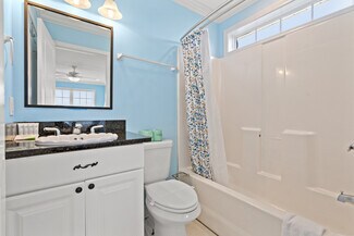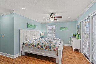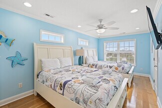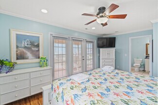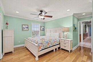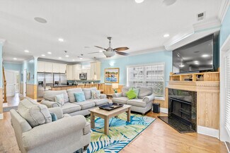 The open living areas are bright and coastal in design, with a chef’s kitchen offering granite countertops, stainless steel appliances (including two refrigerators), a wet bar, and generous seating for family gatherings. Each bedroom enjoys its own en-suite bath, while two primary suites offer private balconies perfect for relaxing after a day at the beach.