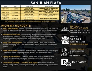 San Juan Plaza offers flexible retail and automotive leasing opportunities at a highly trafficked intersection in Citrus Heights. The property features endcap retail suites fronting San Juan Avenue with the ability to lease individually or combine for a larger footprint, alongside a standalone auto repair building suitable for immediate operation.
