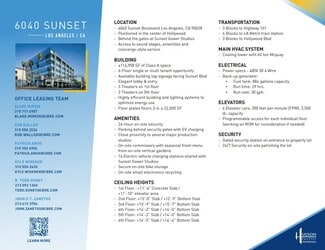 Discover an exceptional opportunity behind the gates of Sunset Gower Studios, offering access to state-of-the-art sound stages, top-notch amenities, and concierge-style service. This six-floor building provides both single and multi-tenant options, featuring expansive ±22,000 SF floor plates on levels 3-6. Enjoy prominent building top signage facing Sunset Blvd, an elegant lobby and entry, and six screening room theaters spread across two floors. The property boasts inviting outdoor collaboration spaces, MERV-13 air filters for enhanced air quality, drinking stations, and an abundance of natural light. Designed for efficiency, it includes advanced building and lighting systems to optimize energy use, alongside 24-hour on-site security. Additional features include 16 shared EV charging stations with Sunset Gower Studios and secure bike storage, making this a highly desirable location for modern businesses.