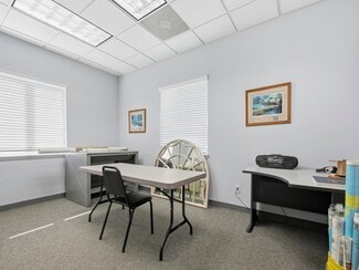 The office section features a welcoming reception area, multiple private offices, and a workroom, creating a functional environment for administrative operations. The warehouse portion includes two 10’x10’ drive-in doors, one 10’x8’ dock door, and a clear height of 14 to 15 feet, accommodating a range of storage and distribution needs. Additional features include a mechanical room, 3-phase 250-amp electric service, and two new HVAC units servicing the office area. The roof is reported to be in great condition per a certified inspector.