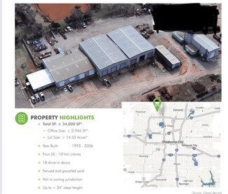 INDUSTRIAL space for lease located in Heavy Industrial ZONING. Perfect location with easy access to Turnpike and Hefner Parkway. Lease offered is for 16,500 SQFT MOL Industrial Warehouse space that includes 12, 18 ft Overhead Doors, 4 separate 10 TON Cranes, parking area, Office space that includes 4 office spaces, 2 of which are double occupancy spaces, and 2 bathrooms, plus lobby. PLENTY of POWER in this industrial space. There is also the ability to rent a 3754 sqft MOL , 30 ft high metal building that also has an 18 ft overhead door plus office area with small garage door for an additional lease space. That space is considered a paint booth but could be used for multiple things. There is additional gravel parking area for rent as well. May be willing to split areas up into two different 8250 mol sqft spaces. Triple net lease. $8 per foot lease plus $3.50 per foot triple net costs.