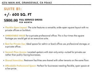 Affordable and flexible office space in the heart of Orangevale. This ±600 SF suite sits on the second floor of The Main Business Park, offering excellent visibility along Main Avenue and quick access to Greenback Lane, Folsom, and nearby amenities. The wide-open layout provides versatility for back office operations, administrative use, or professional storage. With a full-service lease at just $800/month, this space delivers unmatched value for businesses seeking private space at a competitive rate.