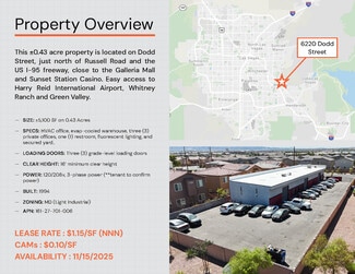 6220 Dodd Street is a ±5,100 SF freestanding industrial building on ±0.43 acres and features HVAC office, evap-cooled warehouse, three (3) private offices, one (1) restroom, fluorescent lighting, secured yard, 16’ clear height, 120/208v, 3-phase power (**tenant to confirm power), and three (3) grade-level loading doors. LEASE RATE: $1.15/SF (NNN); CAMs: $0.10/SF; AVAILABILTY: 11/15/2025. Located on Dodd Street, just north of Russell Road and the US I-95 freeway, close to the Galleria Mall and Sunset Station Casino. Easy access to Harry Reid International Airport, Whitney Ranch and Green Valley. For more information or to schedule a tour please contact Alex Stanisic at 702-369-4874.