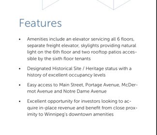 Excellent Opportunity to Purchase a 6 storey Heritage Office Building in Winnipegs Exchange District just steps to Portage and Main. With a history of high Occupancy at 99% filled for over 10 years this gives the Investors confidence going forward with stabilized cash flow. Largely month - month tenancy also gives the opportunity for a user buyer to occupy as much space as they need or as little as they need and keep the in place revenue. Building has 2 elevators, 1 passenger elevator and 1 freight elevator as well as a roof top patio. The tenant mix in this building is Art Galleries, non-profits, lawyers, Architects, landscaping companies, tech companies to name a few. Serious Inquires only