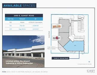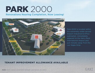 Park 2000 is located within the extremely under-served Airport Industrial & Office submarket, just minutes away from The Las Vegas Strip. The property is located directly adjacent to the McCarran International Airport with immediate access to Interstate highways. The surrounding area is a mature and dense mix of residential, office, retail, and industrial, with the largest recreational park in the state of Nevada just across the street. New ownership has major renovations planned for this well-known industrial park, announcements coming soon.