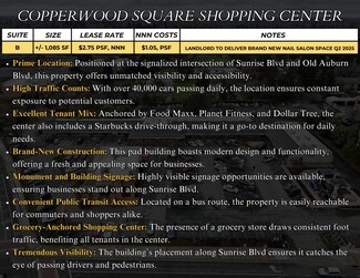 Now leasing: ±1,085 SF retail suite at Copperwood Square, one of Citrus Heights’ busiest shopping destinations. Located at the intersection of Sunrise Blvd and Old Auburn Blvd, this high-visibility pad building will deliver a brand-new, built-out nail salon space by Q2 2025. With national anchors like Food Maxx, Planet Fitness, and Dollar Tree, plus a high-performing Starbucks drive-thru on-site, this center draws steady daily traffic from commuters, locals, and nearby residents alike.