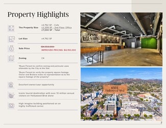 One of a kind 2nd generation cafe space situated on the hard corner of Hollywood & Wilcox in the heart of the World Famous Hollywood Walk of Fame. This is an exceptional opportunity for investors and restaurateurs to acquire a ready-to-operate cafe in one of Los Angeles's most popular tourist districts. Interior: +/- 7,000 SF Land Size: +/- 4,792 SF