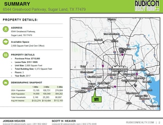 Asking Price: $750,000 Lease Option: $19/SF + NNN Unit Size: 2,600 SF Building Size: 5,372 SF Year Built: 2017 Floors: 3 Condition: Fully furnished, move-in ready Zoning: Office / Professional use Availability: Immediate occupancy
