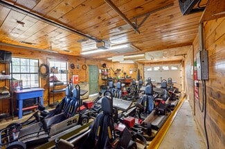 Go-Kart Maintenance Building: Stocked with essential tools such as a lawn mower, welding machine, air compressor, and various other tools to keep the go-kart operations running smoothly.