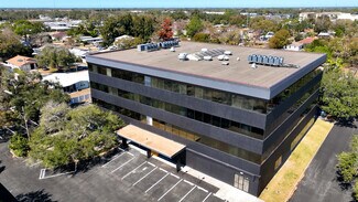 SuitesForAll coworking space offers a modern, professional workspace at 6698 68th Avenue N in Pinellas Park. Recently upgraded, the property's contemporary exterior leads into a vibrant atrium-style lobby, where central balconies on each floor overlook the lobby's sleek reception area, creating a welcoming atmosphere for clients and occupants.