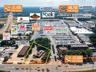 The Property is located within Cumming, GA in Forsyth County, a rapidly growing and highly desirable retail corridor within the Atlanta metropolitan area, approximately ±40 miles north of Downtown Atlanta. Cumming serves as the commercial and civic hub of Forsyth County, one of Georgia’s fastest-growing and most affluent counties, benefiting from exceptional regional connectivity via GA-400/US-19, which links directly to Alpharetta, Roswell, and the broader Metro Atlanta region. Strategically positioned along GA-9/Atlanta Road, less than a block away from the intersection with GA-20 (31,400 VPD) and less than ±0.5 miles from the GA-400/GA-20 interchange (86,700 VPD), the Property enjoys excellent visibility and accessibility in the heart of Forsyth County’s primary commercial corridor. The site sits at the entrance to a major shopping center anchored by Sprouts Farmers Market and Belk, with Chick fil-A and McDonald’s neighboring and KFC located across the street. Featuring a drive-thru permit, the Property offers strong adaptability for restaurant or quick-service operators seeking frontage, access, and traffic exposure. The surrounding corridor features a robust mix of national retailers and service providers including Publix, Walmart, Home Depot, Lowe’s, Kohl’s, and Target, collectively driving consistent daily consumer traffic. The Property also benefits from proximity to Northside Hospital Forsyth (±389 beds), a regional healthcare anchor and major employment center, and Downtown Cumming, which continues to grow as a vibrant civic, dining, and retail destination. Forsyth County remains one of Georgia’s top-performing suburban markets, supported by exceptional demographics with nearly 50,000 residents within a 3-mi radius and more than 124,000 residents within 5-mi, with an average household income (AHHI) exceeding $166,500. This combination of affluence, rapid growth, and limited commercial supply underpins strong consumer demand and long-term stability, positioning the Property as a prime opportunity for retail, restaurant or service-oriented users within one of Metro Atlanta’s most dynamic suburbs.