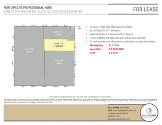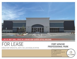 Available for lease is a 1,362 SF grey shell space in a brand new garden office building located on Fort Apache with plenty of street visibility and easy access and easy access to the valley from this premier South West location at Fort Apache and Sunset. Great access to all the amenities the SW has to offer and easy access to the 215 from Sunset on ramp. The building is a band new high image single story multi-tenant office building with plenty of parking and easy accessibility. This is the only remaining suite left in the building. Tenant can build out the space any way the want, Landlord is offering a great TI package.