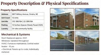 6917 Military Avenue is a well-maintained 12-unit multifamily community located in an established Omaha submarket with consistent rental demand. The property consists of ten (10) one-bedroom, one-bath units and two (2) two-bedroom, one-bath units, offering an efficient and highly leasable unit mix that appeals to a broad renter demographic. With meaningful capital improvements completed under current and prior ownership. The roof and gutters were replaced in approximately 2021, and the parking lot was newly paved in 2025, enhancing curb appeal and reducing near-term capital exposure. Updated windows throughout the property improve energy efficiency and tenant comfort.