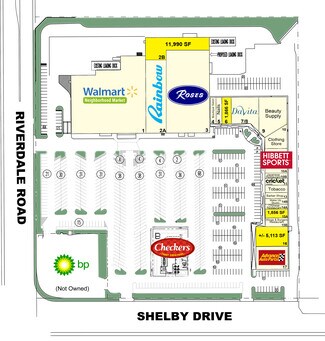 Join a high-performing shopping center anchored by Walmart Neighborhood Market, Rainbow, Roses, Hibbett Sports, and Advance Auto Parts. Shelby Square is 145,073 SF well-established retail destination ideally positioned at the signalized intersection of E. Shelby Drive and Riverdale Road, offering excellent visibility and access to over 32,000 vehicles per day. Prime Retail and Warehouse Space Availalbe.