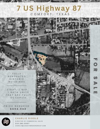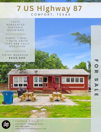 7 US Highway 87 in Comfort, TX, presents an excellent income-generating investment opportunity. This property features historic buildings that have been renovated into eight 1-bedroom, 1-bathroom units, all of which are fully occupied. There is potential for rent increases, should the new owner choose, as well as additional space for further rental development. Tenant privacy is a priority, so the listing agent must be present for all showings. The property is located within a flood plain. Please provide a minimum of 24 hours' notice for showings and contact Charlie Riddle directly at 210-383-0007 for more details.