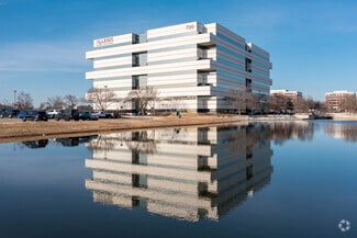 Campus-like setting overlooks lush gardens and surrounding pond with fountain