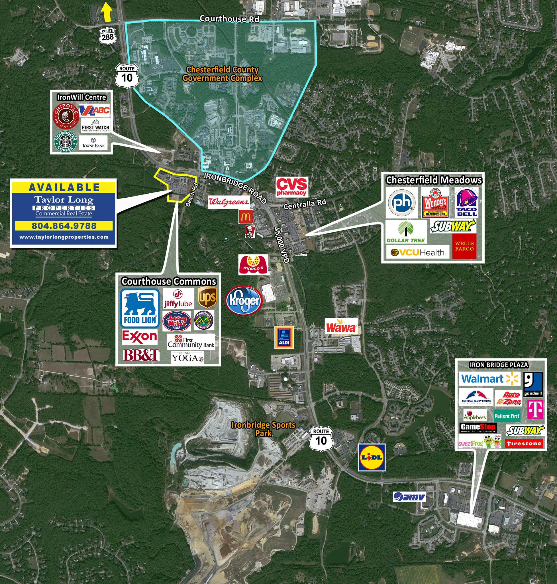 Situated at the prominent signalized intersection of Iron Bridge Rd (Route 10) and Beach Rd, this 84,094 square-foot shopping center is anchored by Food Lion and strategically positioned in the heart of Chesterfield County’s most significant residential growth area. This prime location benefits from a robust daytime population and is conveniently close to Route 288, the Chesterfield County Courthouse Complex, and the Police Department. Surrounding the center, you'll find a diverse mix of well-known retailers, including Kroger Marketplace, Aldi, Starbucks, and Jersey Mike’s, ensuring high visibility and foot traffic. Ideal for businesses seeking a vibrant and growing community with excellent accessibility.