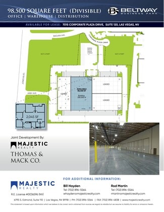Available: 98,500 Sq. Ft. (Divisible to 49,250 SF) | Office: 2,045 SF | Power: 300 Amp, 277/480 V, 3 ph, 4 Wire (Expandable) | Clearance: 32' Minimum @ 1st Column | Sprinkler System: ESFR | Loading Doors: 10 Dock High Doors; 2 Ground Level | Truck Court: 130' Truck Maneuvering | Column Spacing: 50' x 50' (Typical) | Ample Parking Spaces | Radiant Barrier Insulation and Insulated Loading Doors | 60' Concrete Loading Aprons | IP Zoning | Recessed Storefront Entry and Accents