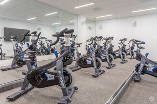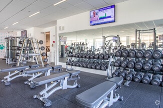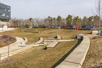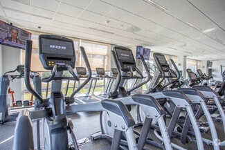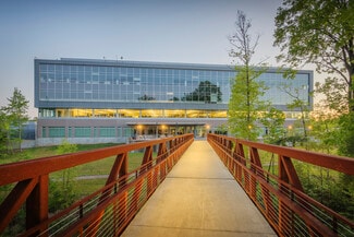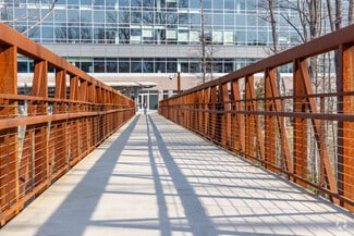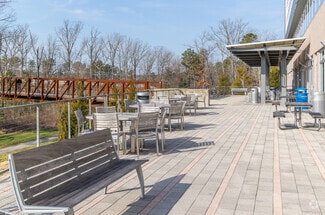 • Amenities include a fitness center with showers, an on-site café, outdoor patio seating, and walking trails.