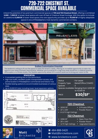Unlock the potential of 3,000 – 10,000 SF of highly adaptable space in one of Center City’s most dynamic commercial corridors! Featuring over 45 feet of Chestnut Street frontage, high foot traffic, and excellent public transportation access, this premier property is an incredible opportunity for retail storefronts, medical offices, fitness studios, and more. Located in the heart of Center City Philadelphia, specifically in the Washington Square West/Midtown Village submarket. This is a dynamic area that blends historic charm, dense office and residential populations, and a strong tourist presence due to proximity to Independence Mall and Old City.