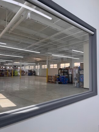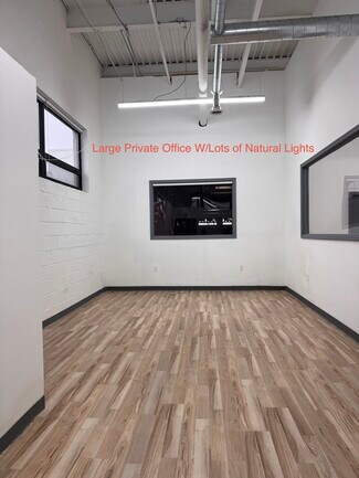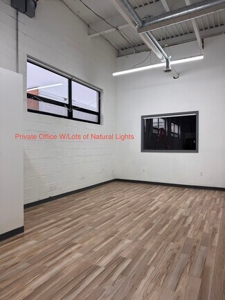 The building features flexible configurations of private offices and warehouse spaces to accommodate a range of business needs, with a combination of open warehouse areas, dedicated office/showroom components, and adaptable layouts. Ceiling heights of approximately 16 feet, LED lighting throughout, and skylights provide a bright, efficient working environment. The structure includes a raised concrete floor system and is supported by three-phase power, making it suitable for a variety of light industrial applications.