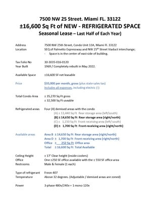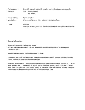 - Cold Storage Refrigerated Cooler Space. Distribution - Newly built refrigerated/cooler equipment in 2022. - Easy access (0.6 Miles) to MIA Cargo Terminals, the Palmetto Expressway (SR 826), and all South Florida expressways.