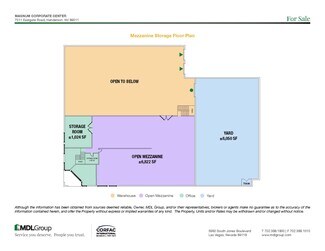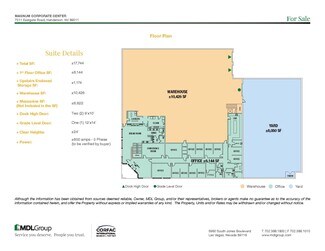 7511 Eastgate Road is located in the Henderson submarket, near Eastgate Rd. and West Warm Springs Rd. The building totals ±17,744 SF consisting of ±6,144 SF of corporate office space including a lobby area, large break room, electrical data room, four (4) restrooms, one (1) large conference room, and seven (7) large office spaces suitable for multiple desk areas. The remaining ±10,426 SF is warehouse space which includes two (2) dock doors and one (1) grade door. The property has it's own private gated yard space (±8,050 SF) and bonus mezzanine space (±6,822 SF) NOT included in the total square footage!