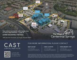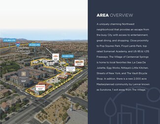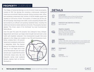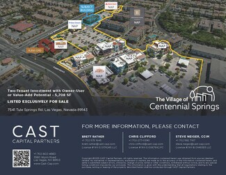 The Village of Centennial Springs is a one-of-a-kind mixed-use property, located at 7541 Tule Springs Rd, including a meticulously maintained mixed-use environment featuring popular dining, boutique retail, office, and residential components that consists of 45,134 rentable square feet situated on 5.79 acres of land.