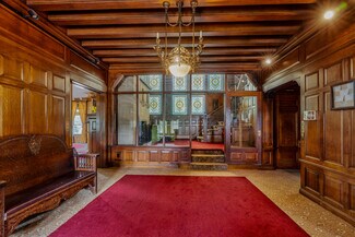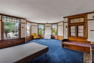 The real showstopper? The third-floor ballroom—a massive 50+ foot open space with hardwood floors, ornate brass chandeliers, and a dramatic vaulted ceiling painted a cheerful sky blue. Original custom millwork wraps the entire room, while built-in window seats and arched alcoves invite conversation, creativity, or quiet reflection. The cozy fireplace nook framed by leaded stained glass windows creates a one-of-a-kind setting unlike anything else on the market.