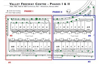Valley Freeway Commerce Center is located just off US-95/I-11 at the Auto Show Drive exit, this property offers freeway visibility with a corporate image. These 4 buildings offer showroom, light distribution and warehouse spaces. Warehouses feature dock & grade loading, fire sprinklers, skylights, 26' clear height, & 120/208 volt 3-phase power.